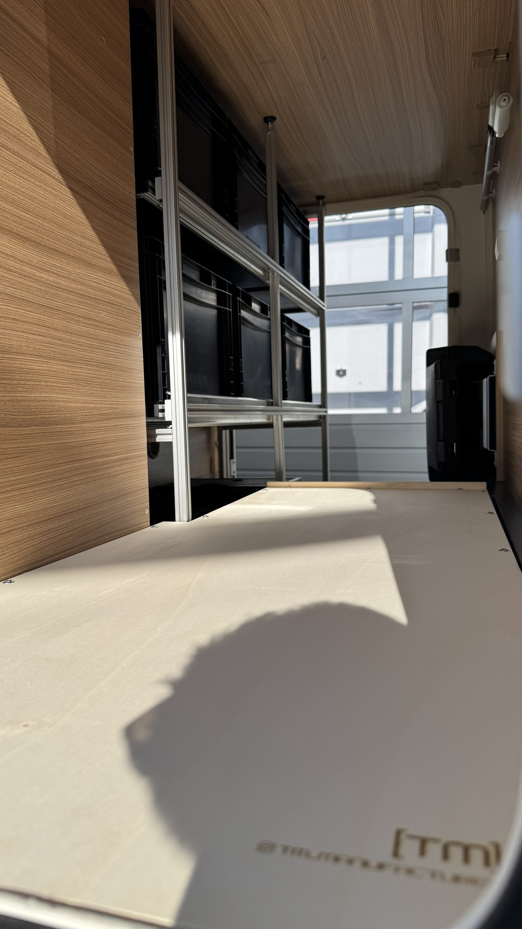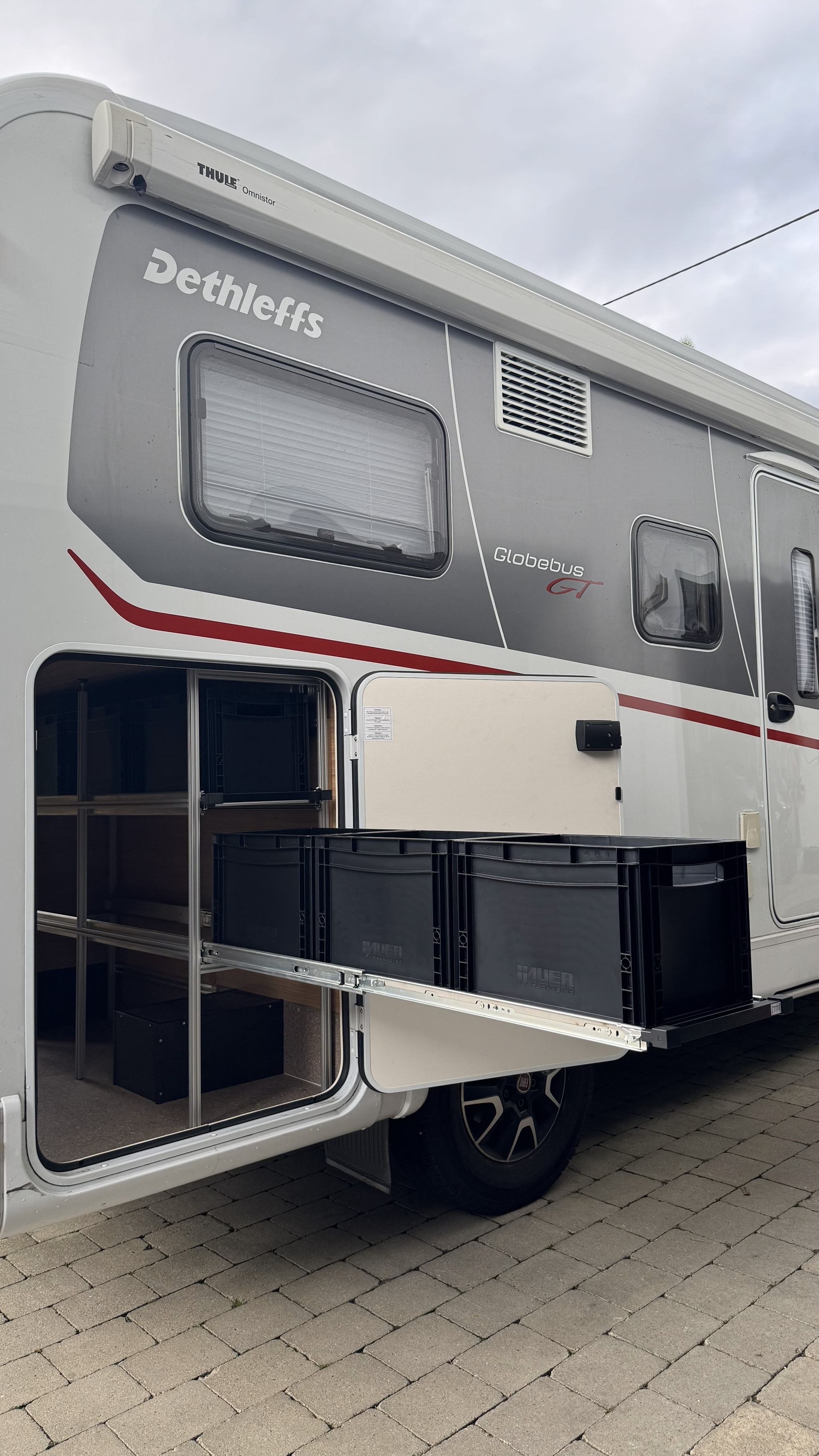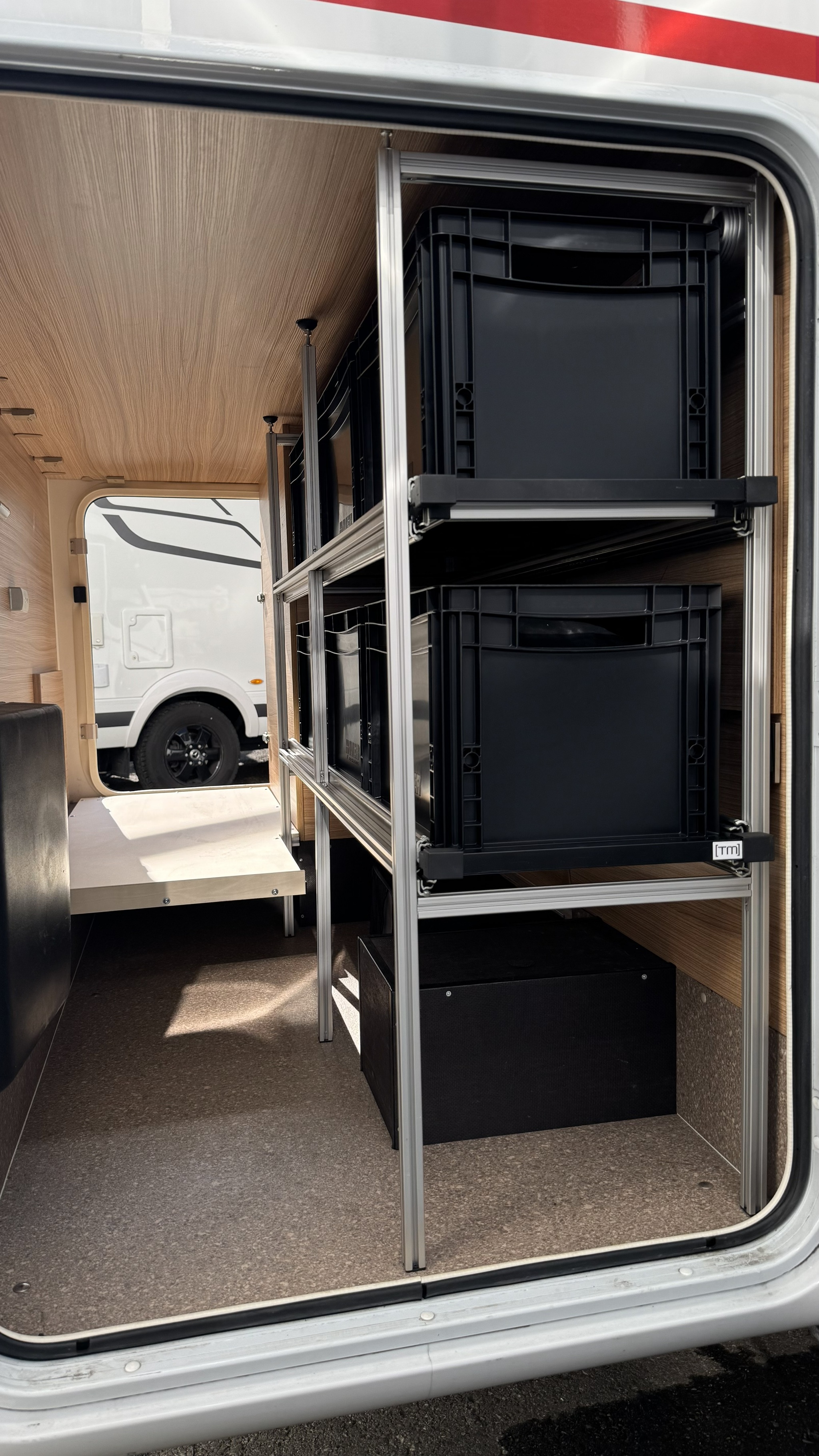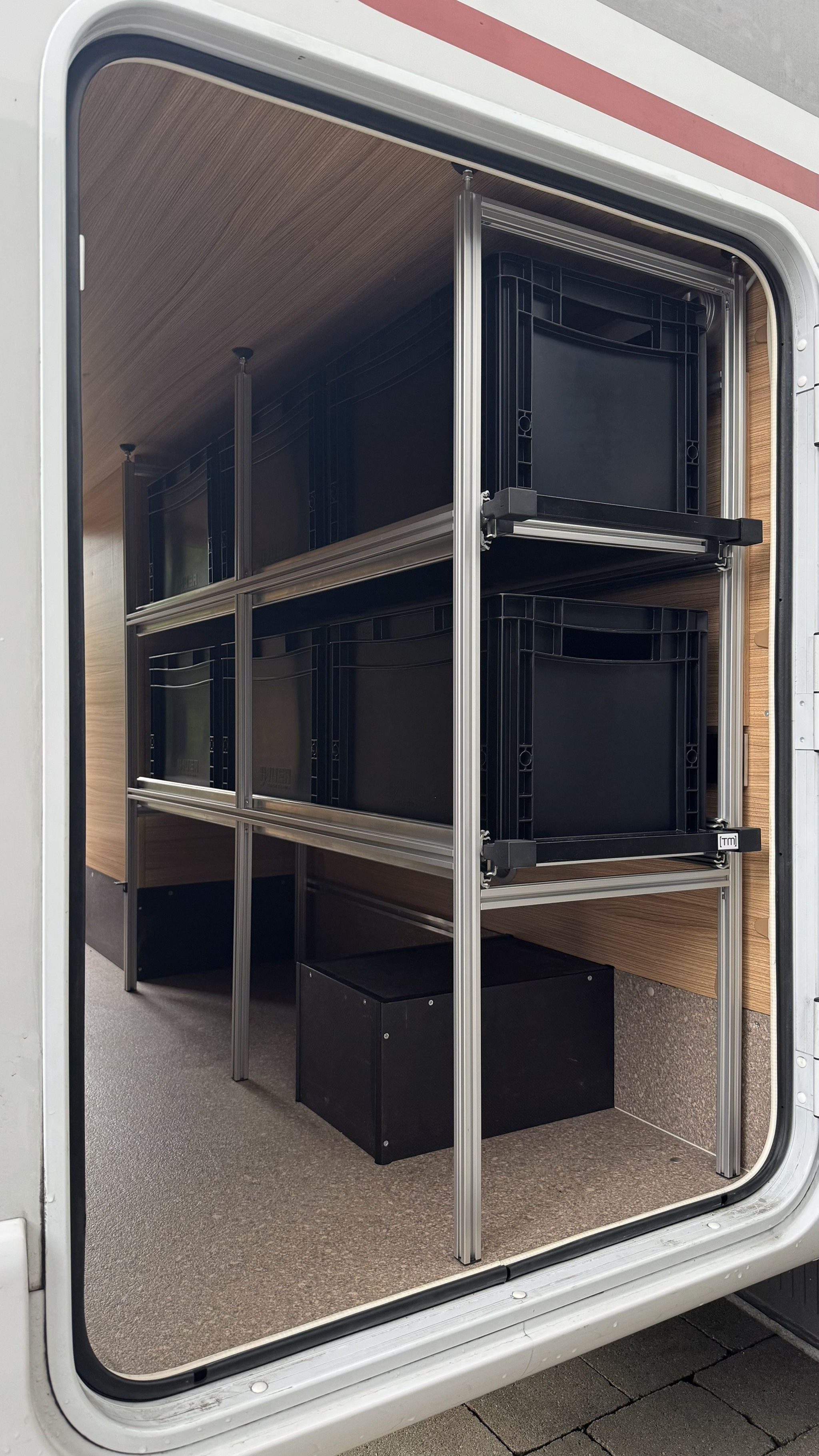 Feste Kistenregale sowie ausziehbare Systeme für Kisten, Tisch und Stühle, Fahrräder, Skier können ebenfalls in nahezu jedem Reisefahrzeug umgesetzt werden. Die Montage der Systeme können in fast jedem Fahrzeug an den vorhandenden Gegebenheiten befestigt werden. So kann bei einem Fahrzeugverkauf alles wieder rückstandslos entfernt werden.